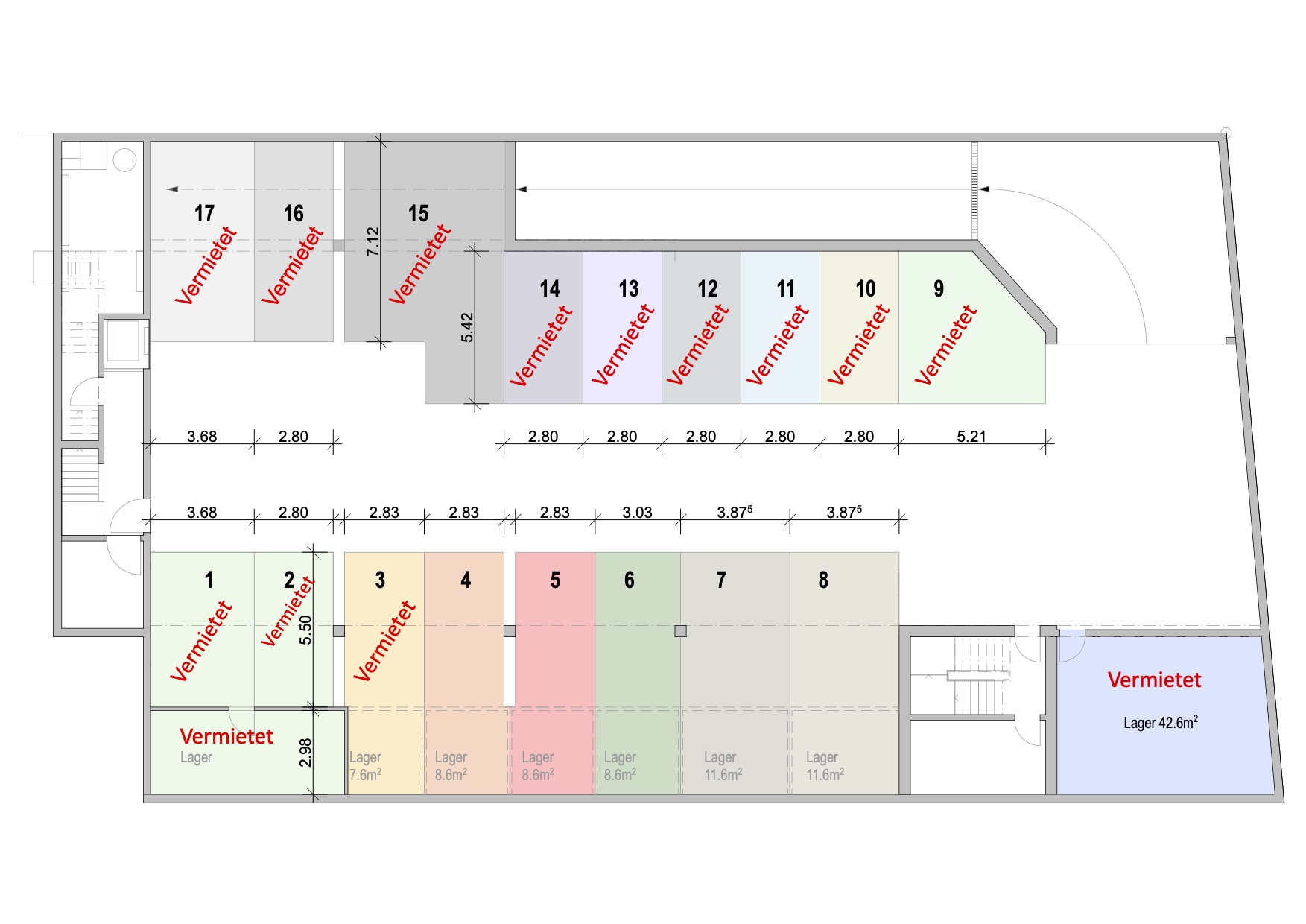 Die Tiefgarage verfügt über eine Raumhöhe von 2.60 Meter und hat einen vollflächigen Hartbetonbelag. Es kann zusätzlich Strom zu den Parkplätzen oder Lagerflächen geführt werden. Die Tiefgarage ist mechanisch belüftet und hat einen Zugang über eine Ampelbetriebene Rampe. Vom Untergeschoss kann man über das Treppenhaus oder den Lift wieder ins Erdgeschoss gelangen.